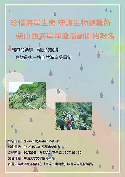 蟹逅 柴山 湧泉》,柴山的生物多樣性、西側礁岩羅列的潮間帶生態、東側的湧泉人文聚落,盡在收攬於柴山周邊。繽紛的柴山五月,邀您來進行一場「山與海、湧泉與聚落、生態與人文」的豐富饗宴。